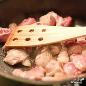 Свинину нарезаем кубиками среднего размера и обжариваем в оливковом масле 7-8 минут. Свинина должна подрумяниться.