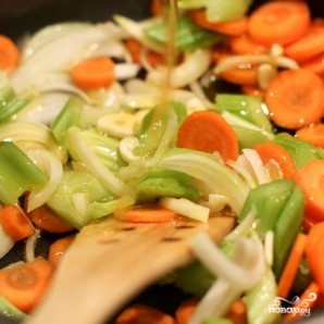Обжаренное мясо перекладываем в какую-нибудь емкость, а в этой же сковороде обжариваем овощи. Зажаривать овощи не нужно - необходимо их всего лишь немного размягчить. Поэтому обжариваем на среднем огне, постоянно помешивая, буквально минут 5-7.