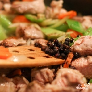 Обжарив овощи, возвращаем в сковороду нашу свинину. Вместе с ней добавляем в сковороду муку, соль, кориандр, корицу и ягоды можжевельника (это по желанию, можно и без них).