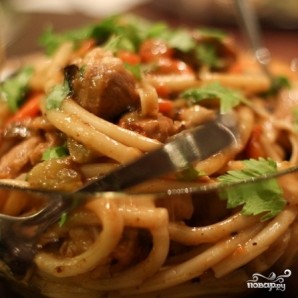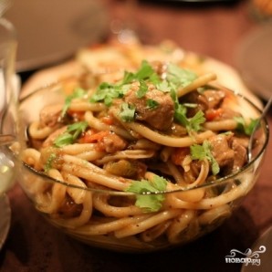 Тем временем отварим лапшу. Лапшу варим примерно на 2 минуты меньше, чем указано на упаковке - чтобы, когда мы смешаем лапшу с соусом, она не развалилась. Так вот, когда лапша будет практически готова, добавляем ее в сковороду с рагу. Перемешиваем и снимаем с огня.