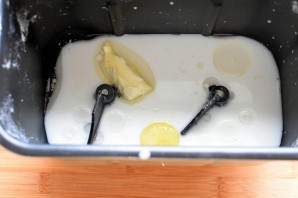Начните с теста. Просейте в миску муку, смешайте ее с сухими дрожжами, сахаром и солью, добавьте теплое молоко и яйцо. Размягченное сливочное масло и растительное добавьте к муке и замесите упругое тесто. Я вымешиваю тесто в хлебопечке.