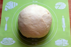 Скатайте тесто в шар, накройте пищевой пленкой и дайте подойти в теплом месте, тесто должно увеличиться вдвое. После чего обомните тесто и дайте ему подойти еще раз.
