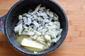 Позолотите лук в смеси растительного и сливочного масла. Добавьте куриное филе, нарезанное мелкими кубиками, и обжарьте до румянца. Добавьте жареные грибы и немного бульона. Посолите и тушите до его полного выпаривания. Остудите готовую начинку, поперчите и добавьте рубленый укроп.