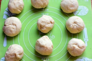 Подошедшее тесто еще раз обомните и разделите на кусочки величиной с некрупное яйцо. Скатайте в шарики и дайте немного подойти, накрыв пленкой.