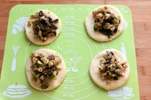 Раскатайте каждый шарик не слишком тонко в круглый сочень и разложите по столовой ложке начинки.