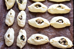 Сформируйте расстегаи, защипывая тесто по краям и оставляя середину распахнутой. Дайте пирожкам подойти, смажьте размешанным с молоком и солью желтком.