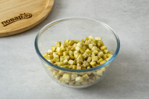 Для начинки очистите баклажан и нарежьте на маленькие кубики. Подсолите, перемешайте и оставьте на полчаса.