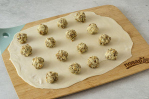 Разделите тесто на 2 части. Раскатайте обе в прямоугольные пласты толщиной 3-4 мм. Выложите на первую шарики с начинкой на небольшом расстоянии друг от друга.