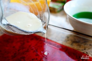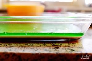 Когда молочный слой слегка застынет (он застывает быстрее, чем цветной), выливаем наверх аналогичным образом приготовленный слой зеленого желе (из лайма). Вновь ставим в холодильник.
