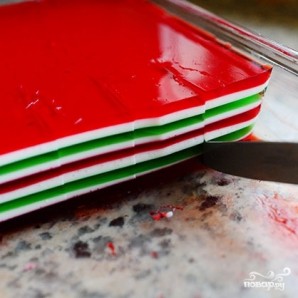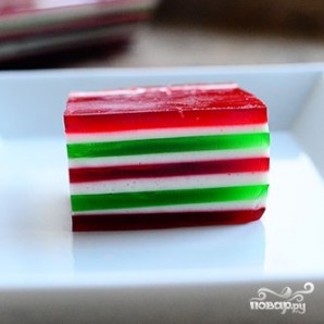 Когда все слои будут готовы, отправляем желе на пару часов в холодильник до окончательного застывания. Затем достаем и нарезаем на красивые квадратики.