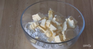 1. Приготовьте песочное тесто. Смешайте 400 грамм муки, 200 грамм сливочного масло (предварительно нарежьте его и положите в морозильник на несколько часов), соль, 100 грамм сахара и разотрите в жирную крошку.
