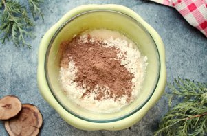 В массу просейте муку с разрыхлителем и всыпьте какао-порошок. Все хорошо перемешайте венчиком до однородного теста.