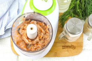 Выложите все нарезки в чашу измельчителя или кухонного комбайна, кроме половины нарезки лука — она понадобится для жарки. По желанию их можно измельчить с помощью мясорубки.