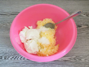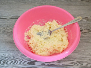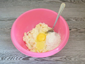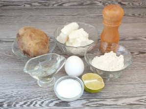 Отварной картофель очистите от кожуры, натрите на мелкой терке. Соедините в чаше картофель, творог, соль.