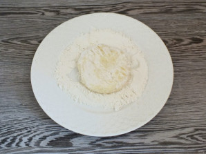 В тарелку насыпьте муку. Творожно-картофельную массу поделите на равные части, скатайте в шарик, придайте форму творожника. Обваляйте в муке с двух сторон.