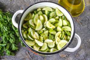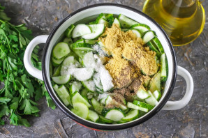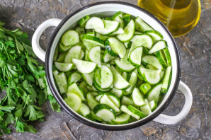 Свежие или слегка переросшие огурцы тщательно промойте в воде, смойте шипы, срежьте хвостики со всех сторон овощей. Нарежьте полукольцами и высыпьте нарезку в кастрюлю или в салатник.
