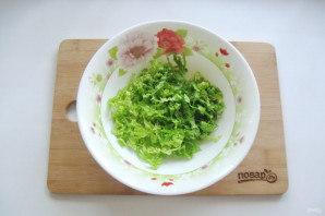 Пекинскую капусту нарежьте соломкой и выложите в салатник.
