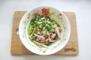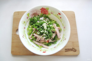 Зеленый лук мелко нарежьте и добавьте в салат.