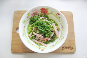 Мелко нарежьте зелень и выложите в салатник.