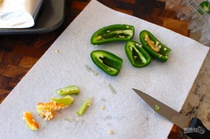 1. Помойте халапеньо, разрежьте его пополам. Если вы хотите более нежную сальсу, то удалите семена, внутреннюю мембрану и используйте только 2 перца; если острую, то семена и мембрану не трогайте и используйте все 4 перца.