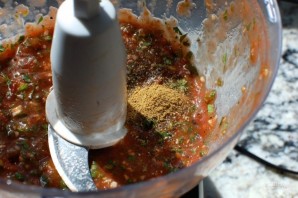 11. Добавьте тмин, черный молотый перец и соль при необходимости, смешайте все в течение 2-3 секунд, если помидоры слишком кислые, то добавьте немного сахара.
