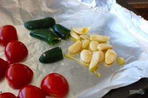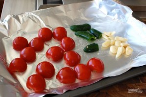 2. Помойте помидоры и разрежьте пополам, почистите чеснок. Выложите помидоры, перец халапеньо срезом вниз на противень, застеленный фольгой, туда же положите чеснок.