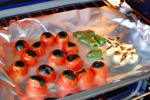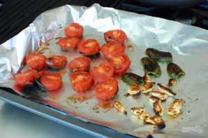 4. Поставьте противень в духовку под гриль на 2 минуты, или в разогретый до 200 градусов духовой шкаф до образования подгоревшей корочки. Следите, чтобы не сгорел чеснок. Кожура помидоров и перца халапеньо может почернеть, это нормально.