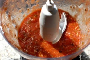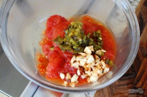 7. Положите в чашу блендера помидоры, перец халапеньо и чеснок, по желанию можете немного отжать помидоры и слить лишнюю жидкость.