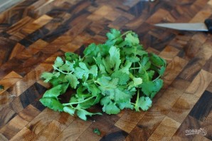 8. Помойте кинзу, отрежьте стебли, крупно нарежьте листочки.