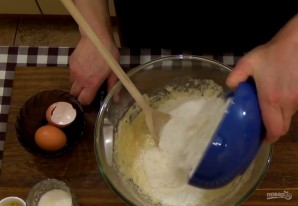 2. Перелейте дрожжи в миску, добавьте небольшими порциями просеянную муку, вбейте два яйца. Месите тесто в течение пяти минут.