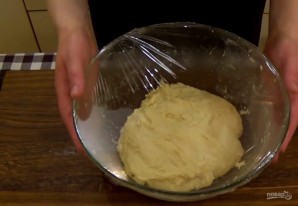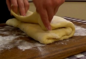4. Затем снова сложите тесто втрое и поместите его в миску, накрыв ее пищевой пленкой на 30 минут. Тесто раскатайте в прямоугольник толщиной 0,7-1 см.