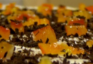 5. Размягченное сливочное масло взбейте миксером с сахарной пудрой. Поверхность теста смажьте взбитым маслом и посыпьте нарезанными цукатами и шоколадной стружкой. Сверните тесто рулетом.