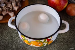 Яйца поставьте вариться в кастрюльке с водой до состояния «вкрутую».