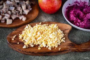 Отваренную свеклу почистите и натрите на крупную терку. Свеклу по возможности отожмите руками. Это необходимо сделать, чтобы ваш готовый салат не «поплыл».