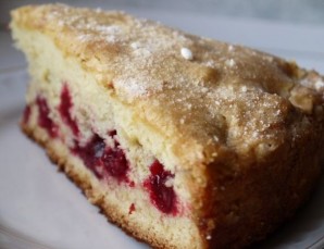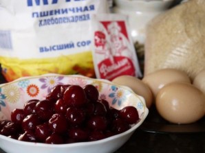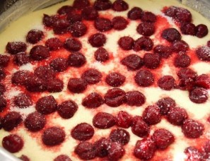 Вылейте в форму часть теста (по консистенции оно должно напоминать густую сметану). Равномерно выложите вишни, посыпьте их сахаром, затем залейте оставшимся тестом.