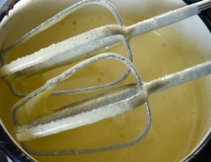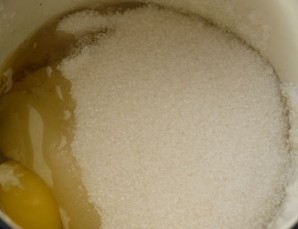 Добавьте в яично-сахарную массу ванилин, муку и гашенную соду на кончике ножа. Все хорошенько перемешайте.