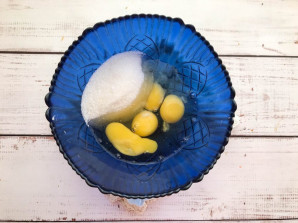 В глубокой емкости соедините яйца с сахаром и солью.