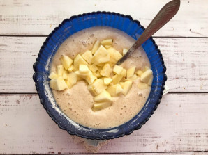 Яблоки очистите от шкурки, удалите сердцевину, нарежьте небольшими кусочками, добавьте в тесто и хорошо перемешайте. Выложите подготовленное тесто в форму для выпекания и отправьте в предварительно разогретую духовку до 180 градусов на 30 минут.