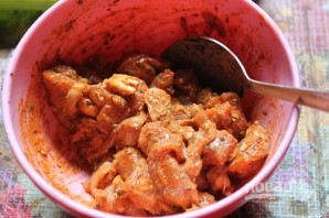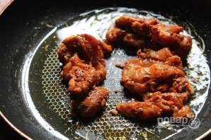 Обжарьте замаринованную курицу в масле до готовности. Не забудьте её переворачивать. Затем отложите её в миску.