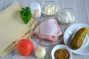 Подготовьте все необходимые ингредиенты. Для одной порции шаурмы я использую 1 куриное бедро. Можно взять куриную грудку, окорок. Курицу натрите солью, специями и отправьте в духовку. Запекайте до готовности.