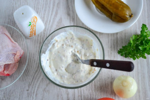 Смешайте сметану, майонез и горчицу. Хорошо перемешайте. Это соус для шаурмы. Можно также использовать черный перец, чеснок.