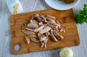 Курица запеклась, кожицу я предварительно сняла, мясо отделила от кости и нарезала на кусочки среднего размера. Слишком мелко, как по мне, не нужно.