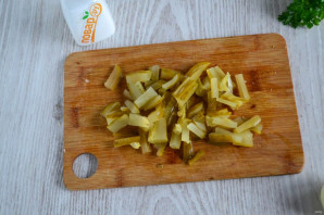 Маринованный огурец нарежьте тонкой соломкой или кубиком.