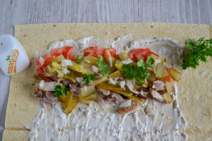 Лист лаваша смажьте соусом, отступая от краев примерно по 3 см. Выложите помидор, курицу и огурец. Мелко нарежьте лук и выложите сверху. Если не любите свежий лук, его можно предварительно замариновать в уксусном растворе. По желанию можно также добавить зелень, обжаренные или маринованные грибы, консервированную кукурузу.