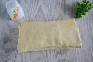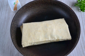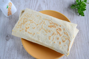 Подверните сначала верхний край, затем по бокам, а затем заверните лаваш с начинкой, как в трубочку.