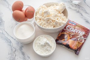 Творожную массу разделите на 2 неравные части. В меньшую часть добавьте какао-порошок и 1 столовую ложку крахмала, в большую — 2 столовые ложки крахмала.