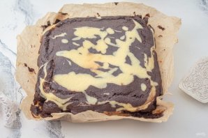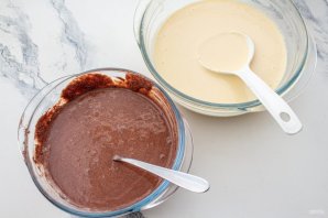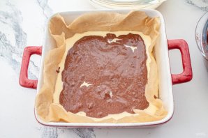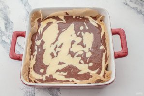 Так поочередно заполняем тестом всю форму, чередуя белое и шоколадное. Ставим творожную запеканку готовиться в духовку, которую нужно заранее прогреть до 180 градусов.