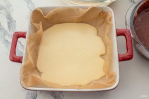 Форму для выпечки диаметром 20 на 20 см. выстелите пергаментом или смажьте маслом. Вылейте на дно 2-3 столовые ложки белой творожной массы.