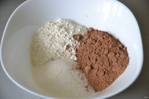 Всыпьте к цедре муку, сахар, какао, перемешайте.