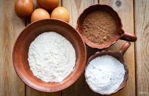 Добавьте 20 грамм какао и также аккуратно вмешайте в яичную массу.